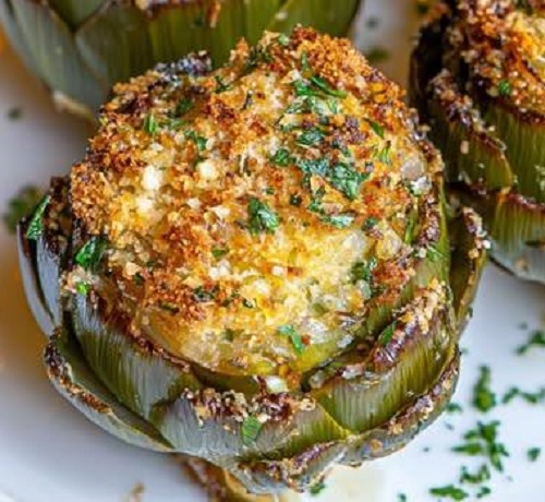Stuffed artichoke is a food prepared in various regions. A common Italian stuffing uses a mixture of bread crumbs, garlic, oregano, parsley, grated cheese, and prosciutto or sausage. The mixture is pushed into the spaces at the base of each leaf and into the center before the