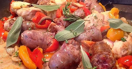 Add the sausage pieces to the same pan, brown them, and add them to the platter with the chicken.