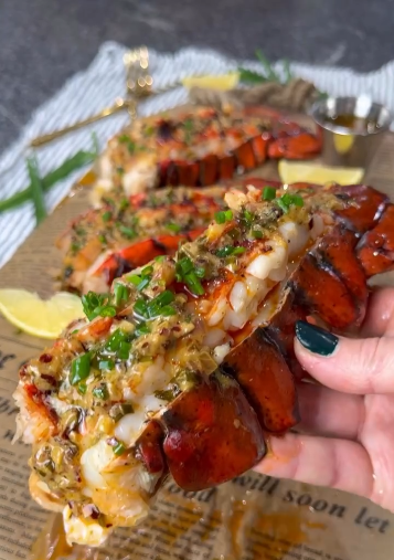 4. Once lobster tails have cooked- brush them generously with the cowboy butter, top with chives and enjoy!